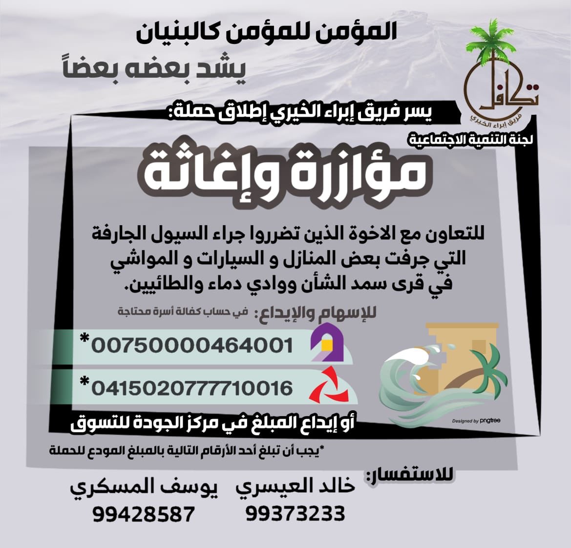 هنا إبراء إبراء تلتزم On Twitter المؤمن للمؤمن كالبنيان يشد بعضه بعضا يدعوكم فريق إبراء الخيري للمساهمة في حملة مؤازرة وإغاثة الأخوة بقرى سمد الشأن و نيابة دماء الذين تضرروا من جراء